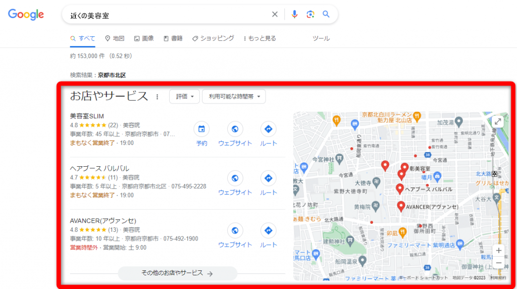 Googleで「浜松町 美容室」や「近くの美容室」「縮毛矯正」など、特定の地域や場所、サービスに関するキーワードで検索すると、検索結果にGoogleマップと共にGoogleに登録されている店舗情報が赤いピンと共に2~3件表示されます。このように場所の影響を受けそうな検索を「ローカル検索」といい、この店舗情報表示枠を「ローカルパック」とよびます。ローカル検索では「広告」や「自然検索」より上部に「ローカルパック」が優先的に表示されるケースが多く、特に飲食店や美容室、宿泊施設を探す場合は、ほとんどのケースで検索結果ページの最上部にローカルパックが出ます。