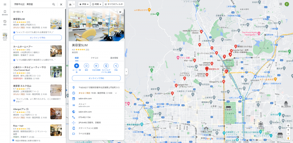 パソコンのブラウザでGoogleマップを使う場合、「浜松町 美容室」や「近くの美容室」「縮毛矯正」などと検索すると、マップ上の店舗所在地にそれぞれ赤いピン、左側に店舗情報が一覧で表示されます。